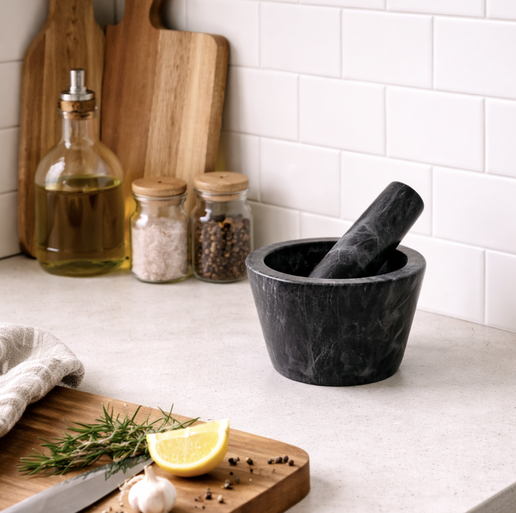 Mortero de mármol negro con terminación pulida semi mate, no porosa (externa) y rústica por dentro.