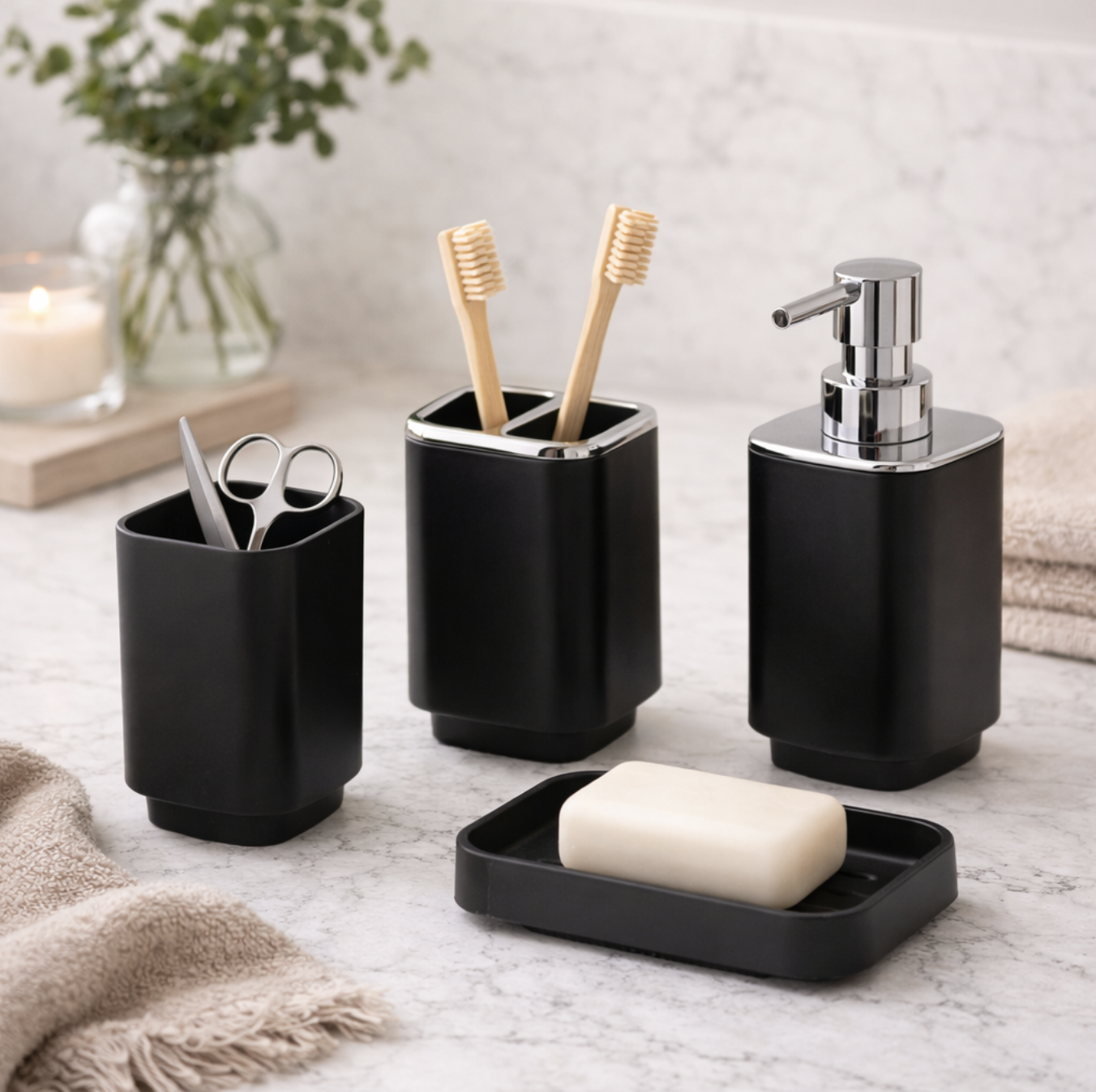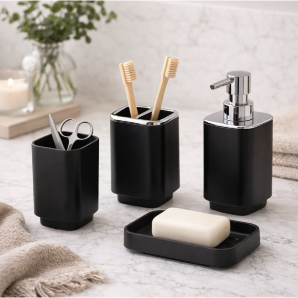 Set de baño negro4 piezasIncluye:- Dispenser de Jabon (7,5x7,5x17 cm)- Jabonera (7,5x11,5x2,5 cm)- Vaso (7,5x7,5x10,5 cm)